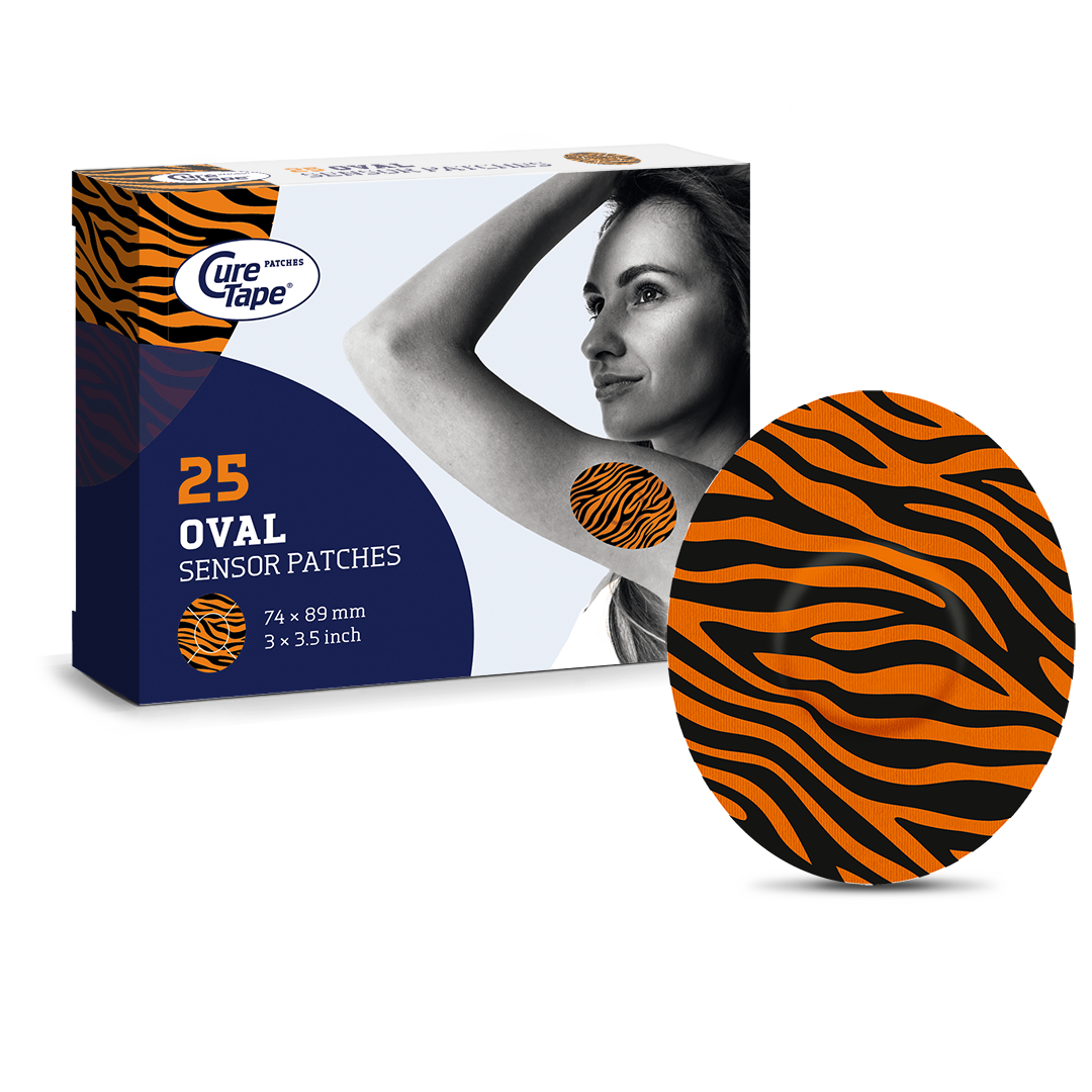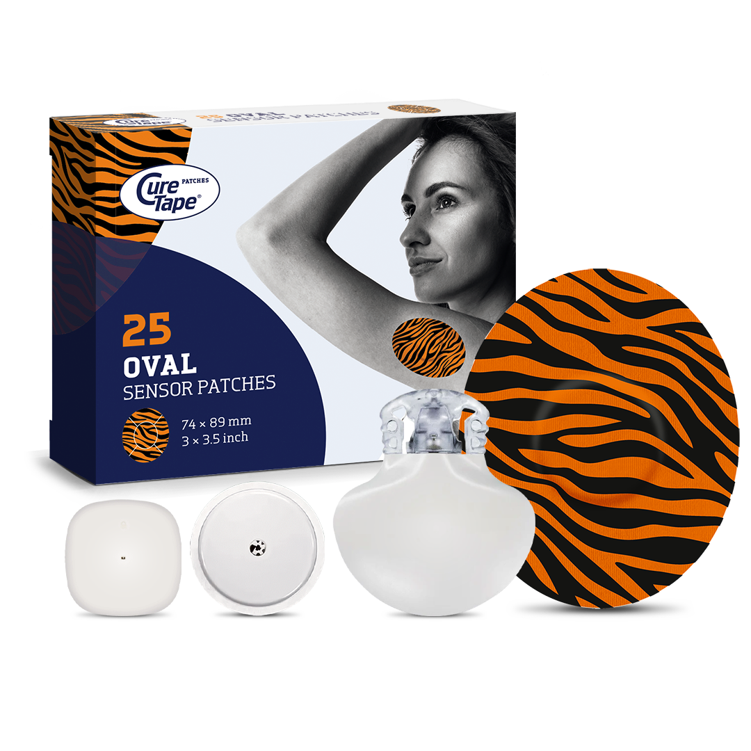 Das ovale Sensor Patch von CureTape ist perfekt dafür geeignet, deinen CGM Sensor zu kaschieren. Eine Packung beinhaltet 25 ovale Overpatches mit einer Größe von 74mm x 89mm.